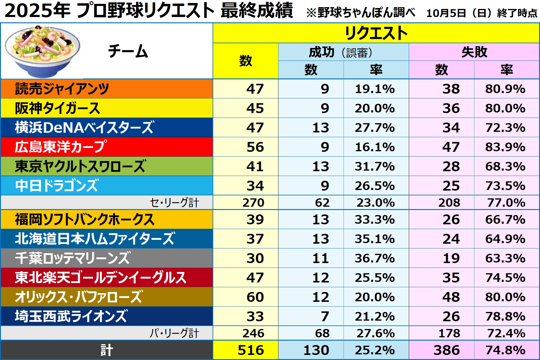 2025年のプロ野球リクエスト(ビデオ判定)成績を記録集計しています。