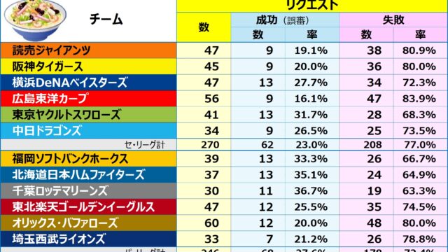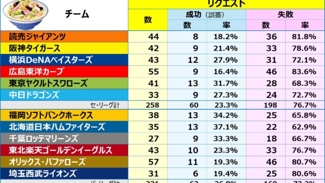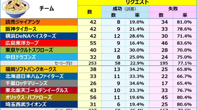 本日のリクエストは0回。成功(誤審)は0回でした。 2025年のプロ野球リクエスト(ビデオ判定)成績を記録集計しています。今シーズンのリクエスト成功率はこれで25.2%。リクエスト数516回、成功130回、失敗386回となりました。 【リク...